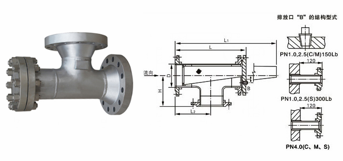 不銹鋼折流式T型過濾器外形結(jié)構(gòu)圖: