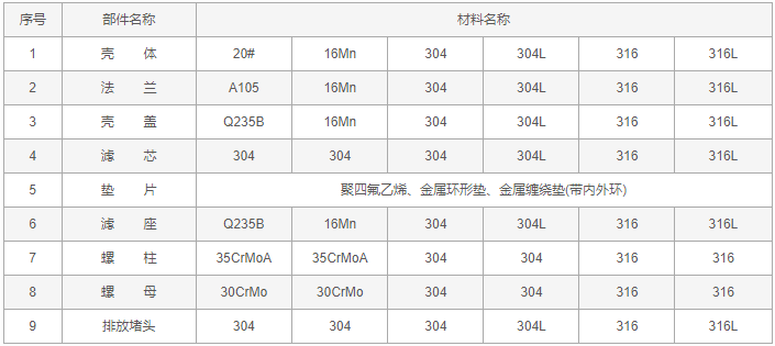 法蘭直流式T型過濾器零件材料: