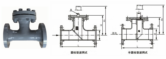 法蘭直流式T型過濾器外形結(jié)構(gòu)圖: