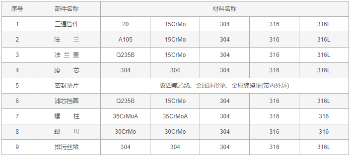 直通式T型過濾器零件材料:
