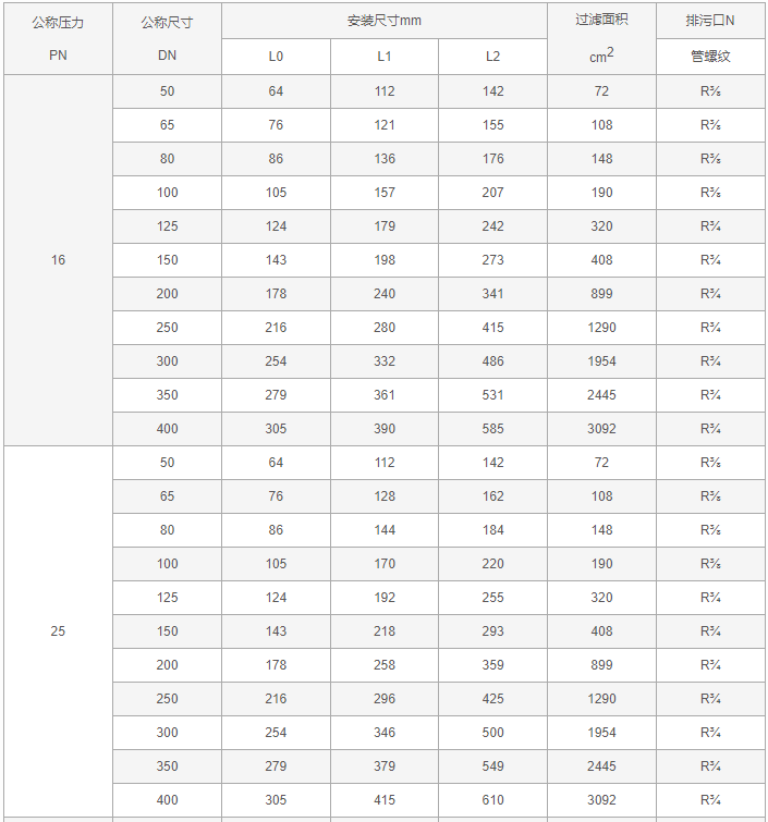 直通式T型過濾器外形尺寸表: