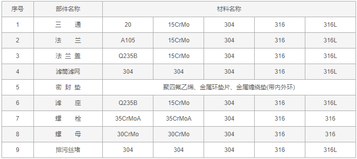 三通反折流T型過(guò)濾器零件材料: