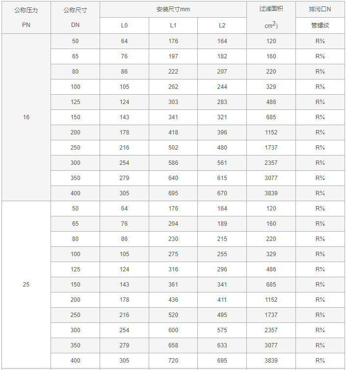 三通反折流T型過(guò)濾器外形尺寸表: