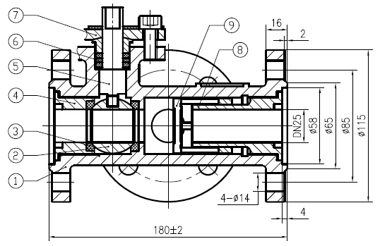 組合式三通球閥由于在高壓和低壓通道內(nèi)分別設(shè)置了球閥和止回閥密封副,通過閥桿旋轉(zhuǎn)球體將高壓通道的球閥密封副打開,高壓通道與中通通道連通,高壓介質(zhì)得以流過閥門,同時(shí)低壓通道內(nèi)的止回閥瓣在高低壓介質(zhì)的壓差作用下將低壓通道關(guān)閉,由此使得高壓通道處于開啟狀態(tài)而低壓通道處于關(guān)閉狀態(tài),經(jīng)閥桿帶動(dòng)球體旋轉(zhuǎn)將高壓通道的球閥密封關(guān)閉,高壓介質(zhì)不能流過閥門,同時(shí)低壓通道內(nèi)的止回閥瓣在低壓介質(zhì)的壓力下脫離低壓閥座,使低壓介質(zhì)得以流過閥門,由此使得高壓通道處于關(guān)閉狀態(tài)而低壓通道處于開啟狀態(tài),實(shí)現(xiàn)了三通閥的目的。該閥由于將中間腔體的三通球體變?yōu)楦邏和ǖ赖亩ㄇ蝮w,并通過高壓通道的開啟和關(guān)閉控制低壓通道的關(guān)閉與開啟,當(dāng)高壓通道關(guān)閉時(shí),高壓介質(zhì)將球體壓向閥座,壓力越大球體和該閥座之間的密封力就越大,由此避免了高壓介質(zhì)通過球閥密封副向中通通道的泄漏。本產(chǎn)品的結(jié)構(gòu)長(zhǎng)度與傳統(tǒng)的L型三通球閥相同。