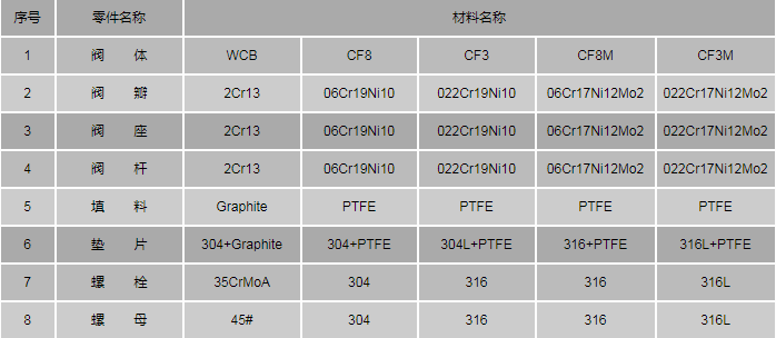 不銹鋼下展式放料閥零件材料: