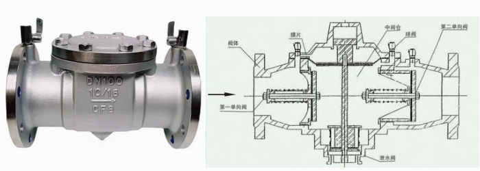 2、當(dāng)進(jìn)水口壓力與泄水閥腔的壓力差小于0 02Mpa時(shí),介質(zhì)處于倒流的臨界狀態(tài),這時(shí)泄水閥膜片上部壓力小于泄水閥腔和彈簧的壓力,泄水閥自動(dòng)開啟,將倒流介質(zhì)排出管外,同時(shí)大量空氣進(jìn)入閥腔,形成空氣隔斷.杜絕介質(zhì)倒流,大于0 02Mpa時(shí)泄水閥自動(dòng)關(guān)閉。