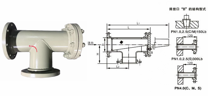 T型反折流式過濾器與正折流式T型過濾器在主要零部件、外形、結(jié)構(gòu)、尺寸上基本相同,主要區(qū)別在于濾筒的絲網(wǎng)安裝有別,正折流式絲網(wǎng)安裝在濾筒內(nèi),反折流式絲網(wǎng)則安裝在濾筒外,正折流式過濾的時候一般流體是從濾筒內(nèi)流向?yàn)V筒外,而反折流式過濾的時候是從濾筒外流向?yàn)V筒內(nèi)。