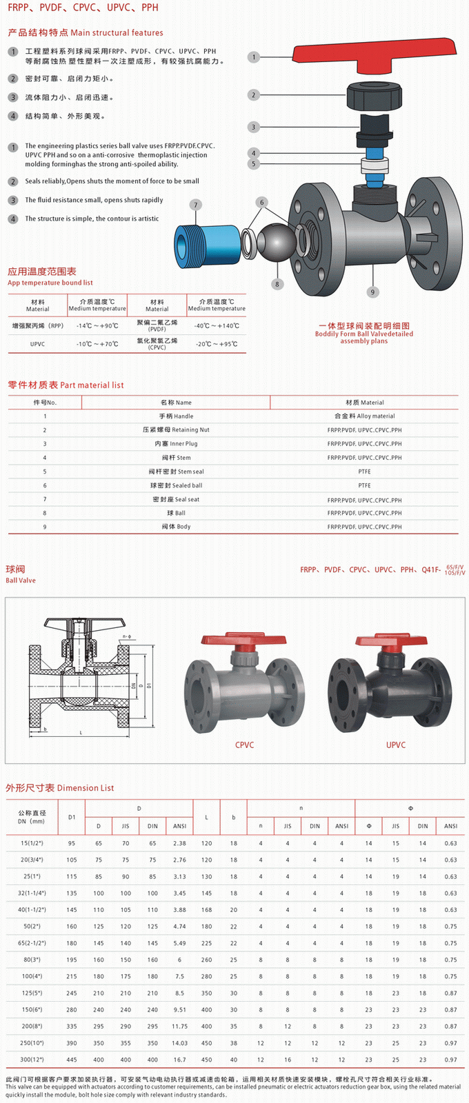 RPP,PPH,PVC,PVDF塑料球閥是公司全塑閥門系列產(chǎn)品,塑料球閥耐腐蝕性能優(yōu)良,密封圈采用F4,密封可靠,啟閉力矩小,流體阻力小,啟閉迅速,結(jié)構(gòu)簡單,外形美觀。隨著塑料管道在冷熱給水和工業(yè)管道應用中所占比例的不斷提高,塑料閥門的質(zhì)量控制越來越顯得尤其重要。由于塑料閥門所具有的質(zhì)量輕、耐腐蝕、不吸附水垢、可與塑料管路一體化連接和使用壽命長的特點,其各方面應用的優(yōu)勢是其他閥門無法相比的。塑料球閥詳細資料: