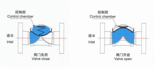 V型隔膜閥的關(guān)閉與開(kāi)啟是通過(guò)來(lái)自管路的壓力作用于增強(qiáng)橡膠隔膜實(shí)現(xiàn)的。來(lái)水壓力直接通過(guò)密封隔膜開(kāi)關(guān)閥門,隔膜上腔有壓時(shí),隔膜切斷進(jìn)水關(guān)閉閥門??刂魄恍箟簳r(shí),利用來(lái)水壓力自動(dòng)頂開(kāi)隔膜打開(kāi)閥門。閥門唯一活動(dòng)部件為增強(qiáng)橡膠隔膜,在水通路上沒(méi)有閥軸、密封等,閥體采用PVC材料,可配合各種電磁閥、手動(dòng)閥、減壓閥等實(shí)現(xiàn)各處控制功能。