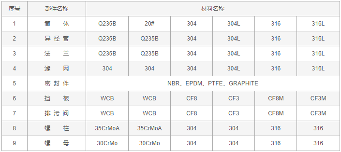 全自動(dòng)反沖洗排污過(guò)濾器零件材料表: