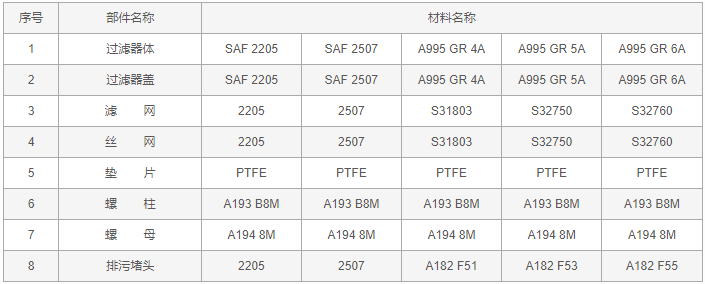 雙相鋼Y型過濾器零件材料表: