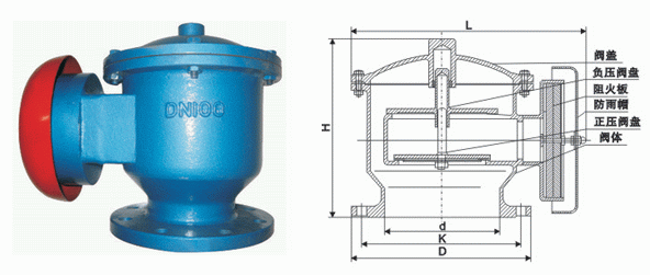 采用彈簧限位閥板,由正負壓力決定或呼或吸。呼吸閥應該具有泄放正壓和負壓兩方面功能,具體則是:當容器承受正壓時,呼吸閥打開呼出氣體泄放正壓;當容器承受負壓時,阻火呼吸閥打開吸入氣體泄放負壓。由此保證壓力在一定范圍內(nèi),保證容器安全。