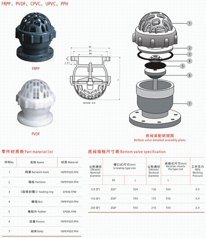 塑料底閥是一種節(jié)約能源的閥,一般安裝在水泵水下吸管的底端,限制水泵管內(nèi)液體返回水源,起著只進不出的功能。閥蓋上有很多個進水口和加強筋,起到了不易堵塞,主要應(yīng)用在抽水的管路上。水道和支承的作用.口徑有單瓣、雙瓣、多瓣型,有法蘭連接和螺紋連接。塑料底閥由閥體、閥蓋、閥瓣、密封圈和墊片等部件組成。底閥在接入管路后,液體介質(zhì)從閥蓋方向進入閥體,液體的壓力作用于閥瓣,使得閥瓣被打開允許介質(zhì)流過,當(dāng)閥體內(nèi)的介質(zhì)壓力變化或消失時,閥瓣關(guān)閉阻止介質(zhì)倒流。塑料底閥零件材質(zhì)表: