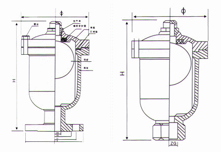單口排氣閥主要由閥體、閥門、上蓋、閥桿、浮球、排氣嘴等組成。當需要排出管道內的氣體時,管道內的空氣在水的壓強作用下進入體腔內,并從排氣嘴排出,隨之管道內的水充滿體腔內,使浮球在水的浮力作用下,向上移動將排氣嘴堵塞,達到自行密封,管道在正常行中,水中的空氣在壓強的作用下,不斷排入排氣閥的體腔上部,迫使浮球下降,離開原來密封位置,這時空氣又從排氣嘴排出,隨之,浮球又恢復到原來位置自密封,因此,排氣閥在正常工作中閥門始終是開著的,浮球不斷重復上述動作,空氣不斷排出。當需要檢修或清掃體腔時,應將閥門關閉。單口排氣閥,順時針旋轉閥桿時為關閉。
