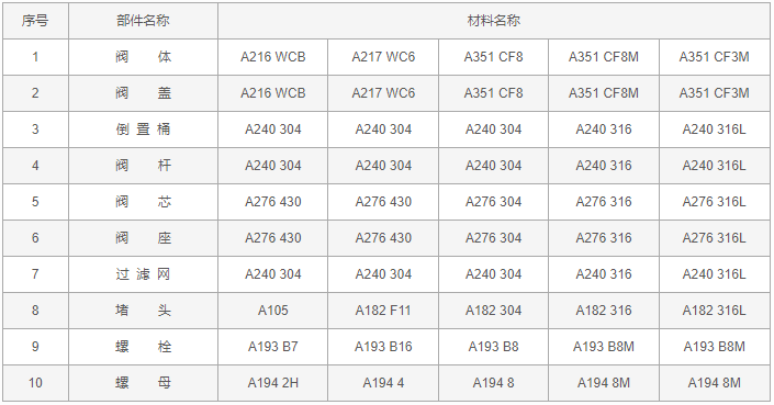 倒置桶式蒸汽疏水閥零件材料: