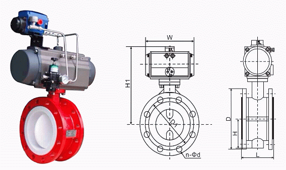 法蘭式氣動襯氟蝶閥外形結構圖: