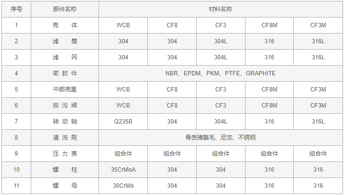 手搖刷式Y(jié)型過(guò)濾器零件材料: