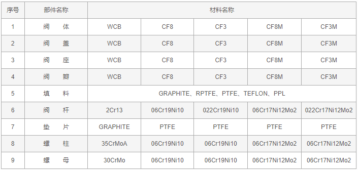 反應釜上展式放料閥零件材料: