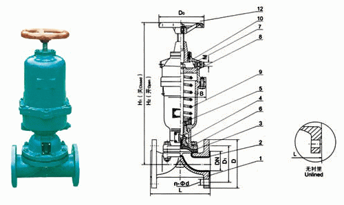 3、視膠隔膜閥的閥體內(nèi)腔表面視復有廳供選擇的多種橡膠。因此具有優(yōu)越的耐腐蝕的特點。