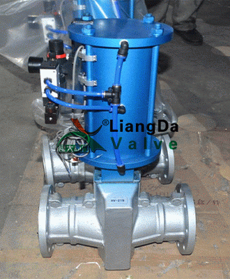 氣動(dòng)頭通氣時(shí),使閥桿向下運(yùn)動(dòng)來(lái)帶動(dòng)上下壓板以壓縮套管進(jìn)行關(guān)閉,反之即開啟。壓板在拉桿之間上下往復(fù)運(yùn)動(dòng)完成閥門開閉工作。