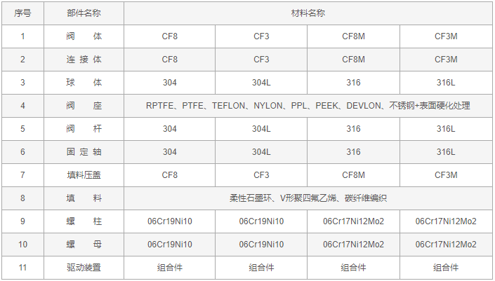 不銹鋼固定式球閥零件材料: