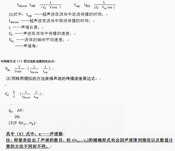 流量計(jì)以測量聲波在流動介質(zhì)中傳播的時(shí)間與流量的關(guān)系為原理。通常認(rèn)為聲波在流體中的實(shí)際傳播速度是由介質(zhì)靜止?fàn)顟B(tài)下聲波的傳播速度和流體軸向平均流速在聲波傳播方向上的分量組成。如下示意圖所示,順流和逆流傳播時(shí)間與各量之間的關(guān)系是: